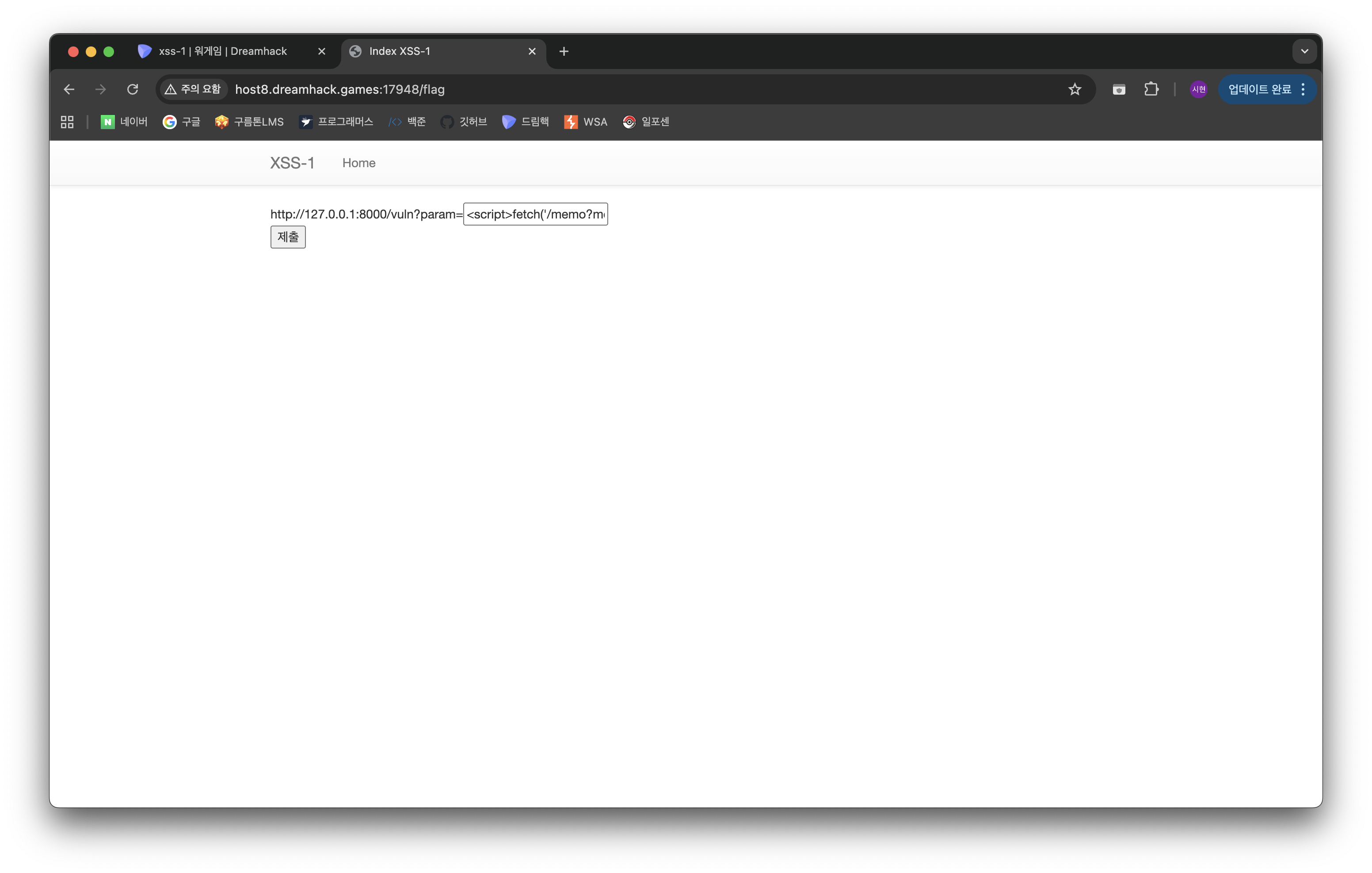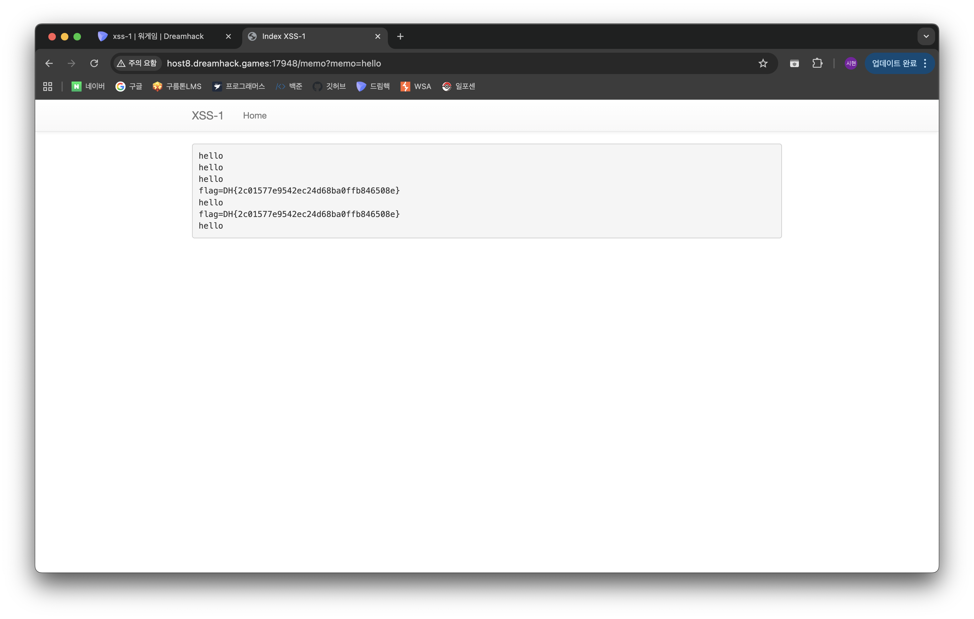 이 요청은 이제 /memo로 보내지고, 서버는 이 값을 memo_text에 누적하며, 사용자가 /memo에 접속하면 flag가 보이게 될 것이다.
