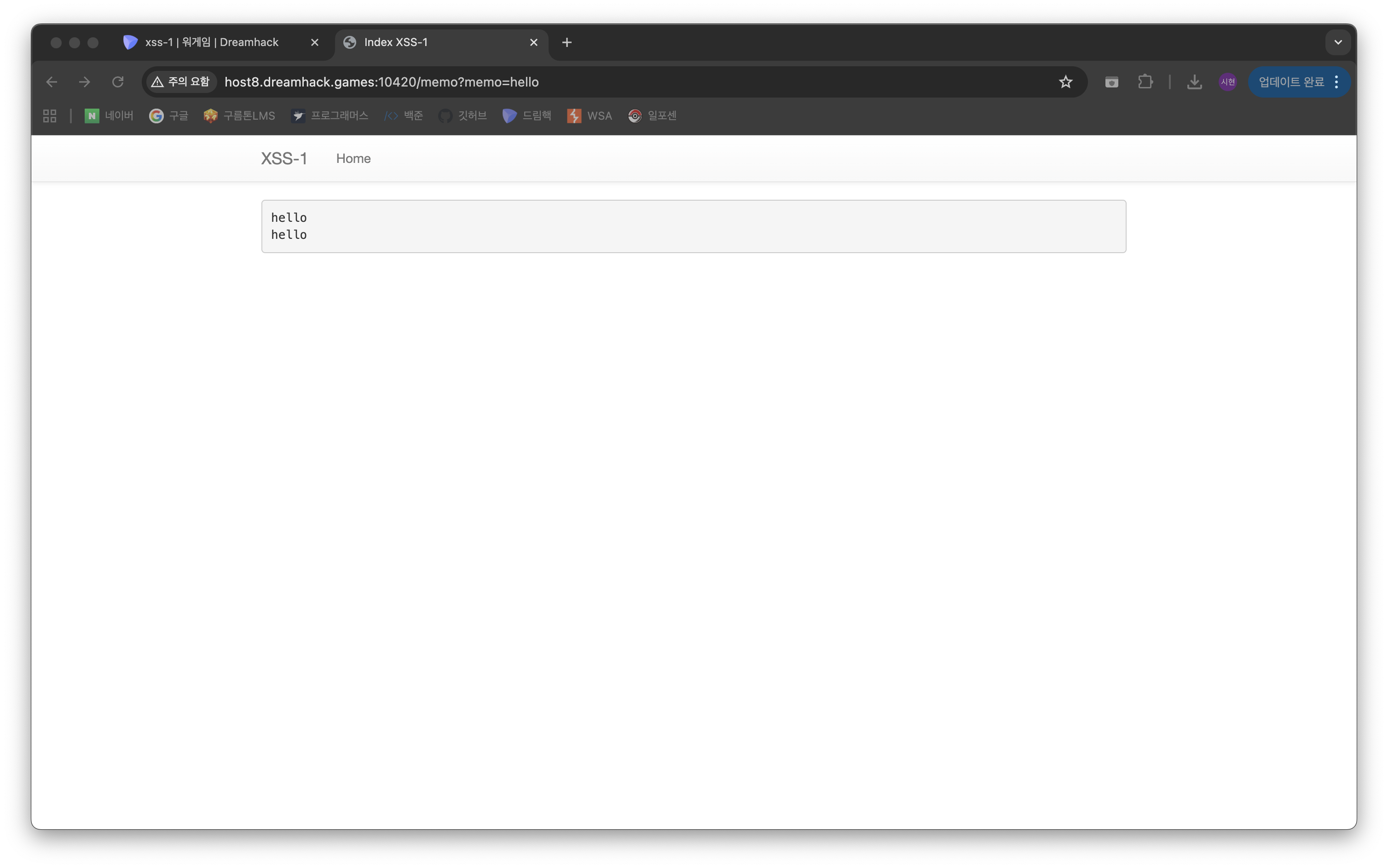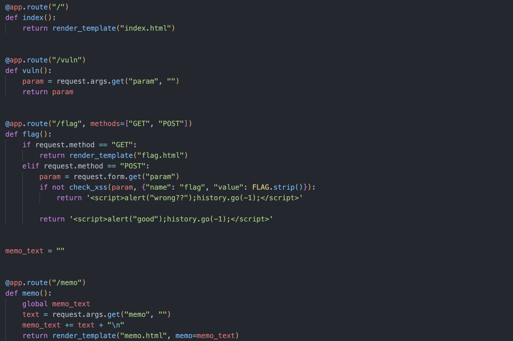 마지막으로 /memo에서는 전역 문자열 memo_text에 ?memo=.. 값을 줄바꿈과 함께 누적 저장한다. (memo 페이지에 들락날락하면 hello 문자열이 점점 쌓이는 것을 볼 수 있다.)