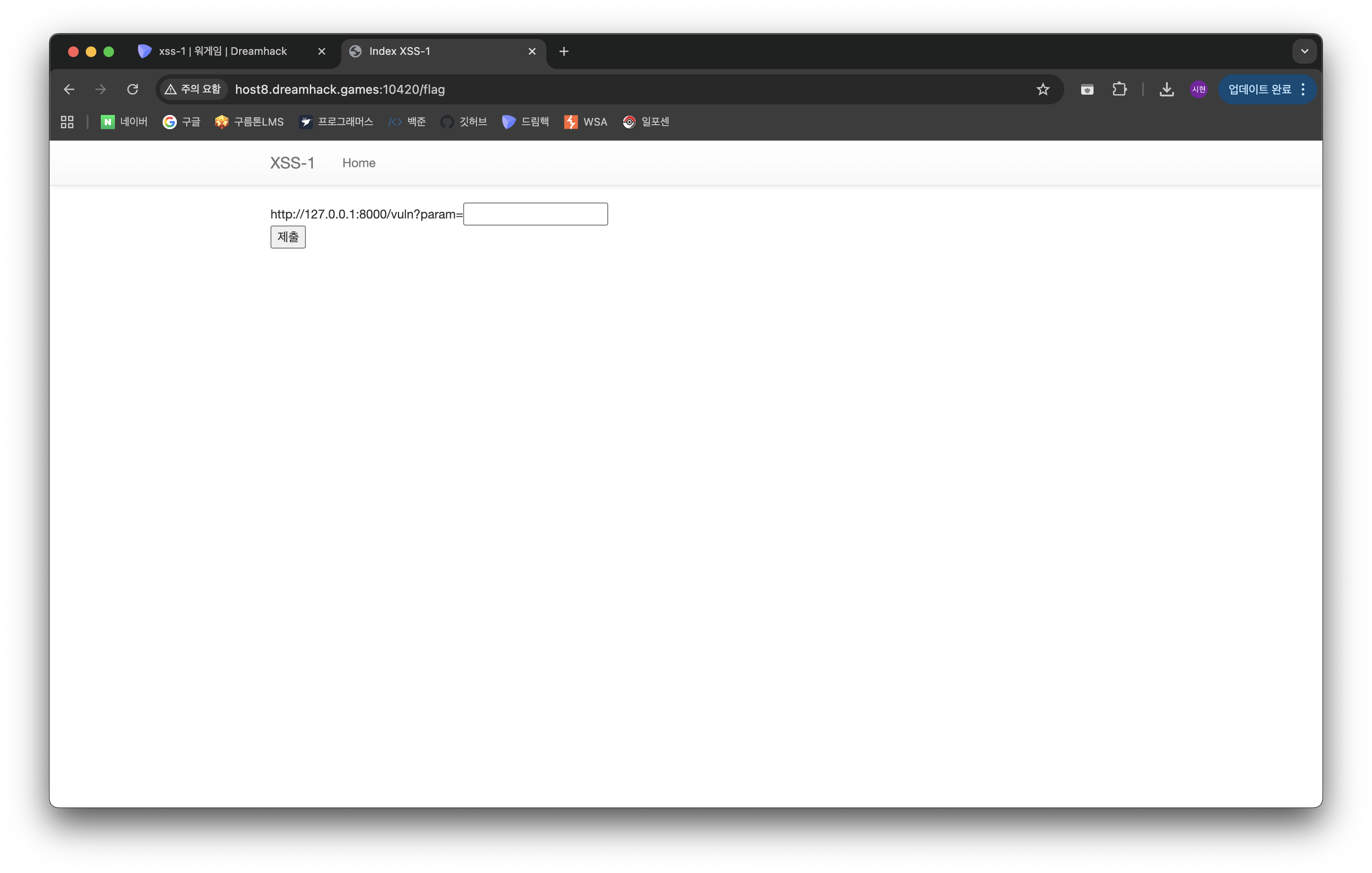 사용자가 제출한 param을 받으며, check_xss함수의 url에 flag 이름의 쿠키를 주입한다. 그럼 check_xss함수는 받은 param과 cookie로 url을 생성하고 헤드리스 크롬으로 접속한다.