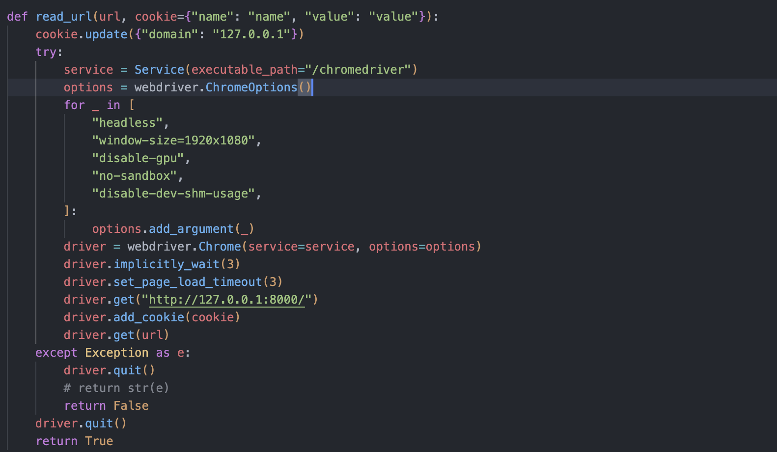 받아온 cookie에 domain 키를 강제로 127.0.0.1로 설정하고, 크롬드라이버 바이너리 경로를 /chormedriver로 지정하고 브라우저 옵션 객체를 생성한다. 그리고 쿠키를 현재 도메인에 삽입한 후 최종 목적지(url)로 이동한다.