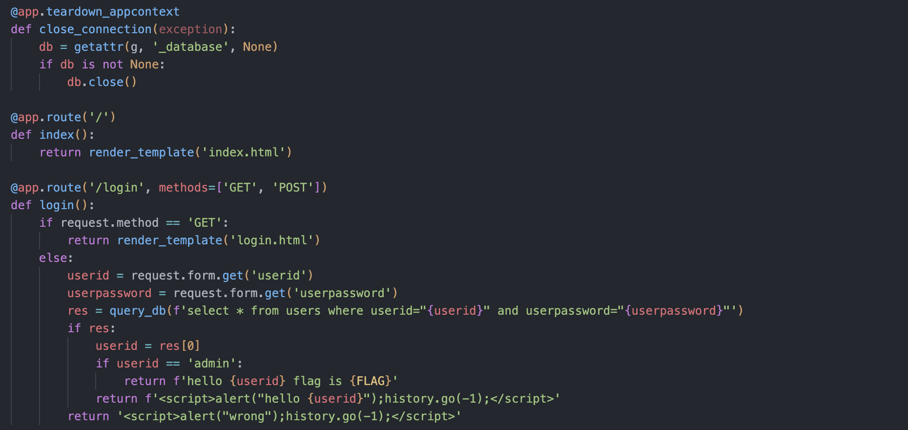 근데 여기 query_db함수에서 다른 시큐어 코딩 없이 query 인자 값 그대로 실행하는 것을 볼 수 있다.