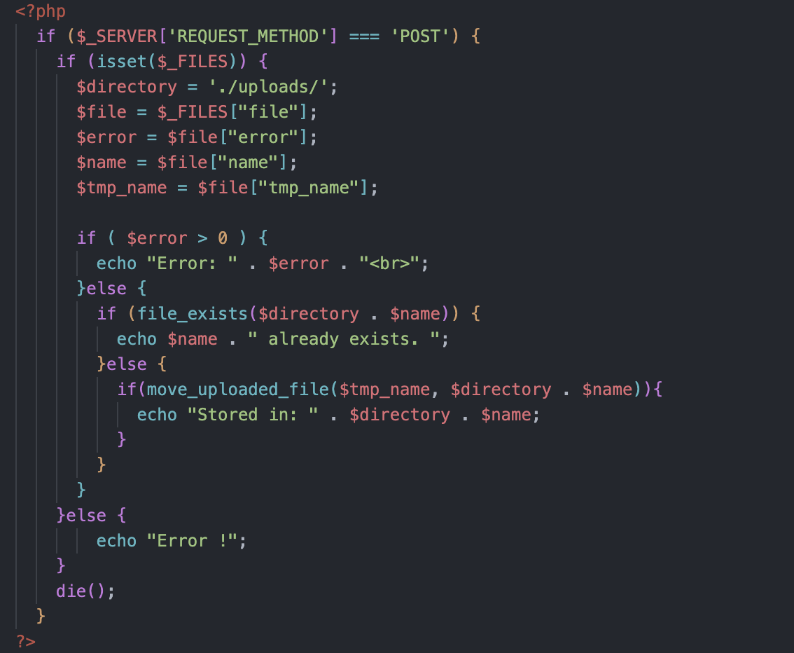 역시나 디렉터리가 uploads로 고정되어있고, 에러 처리 코드랑 중복 처리 코드도 있는 것을 볼 수 있다.