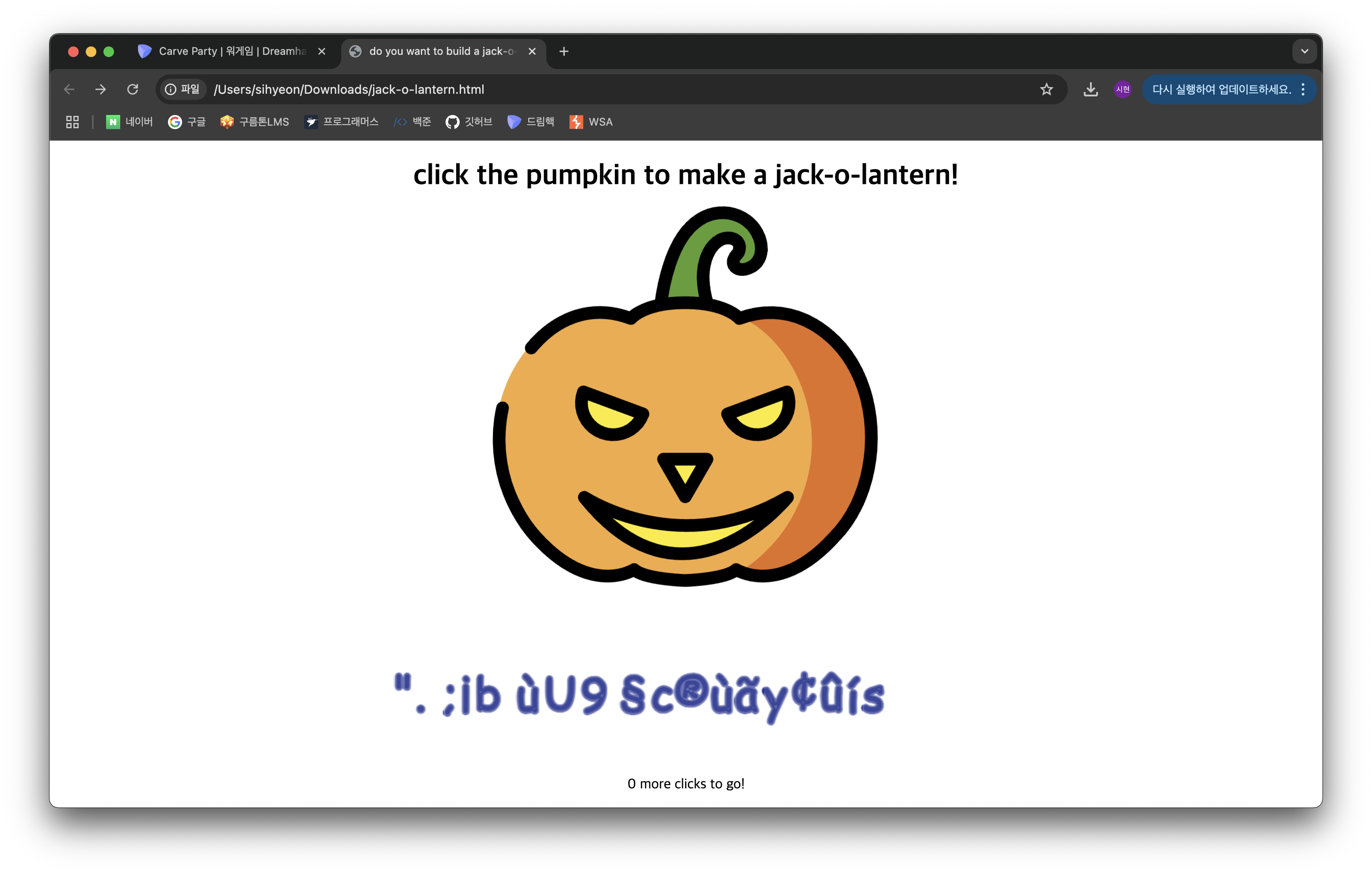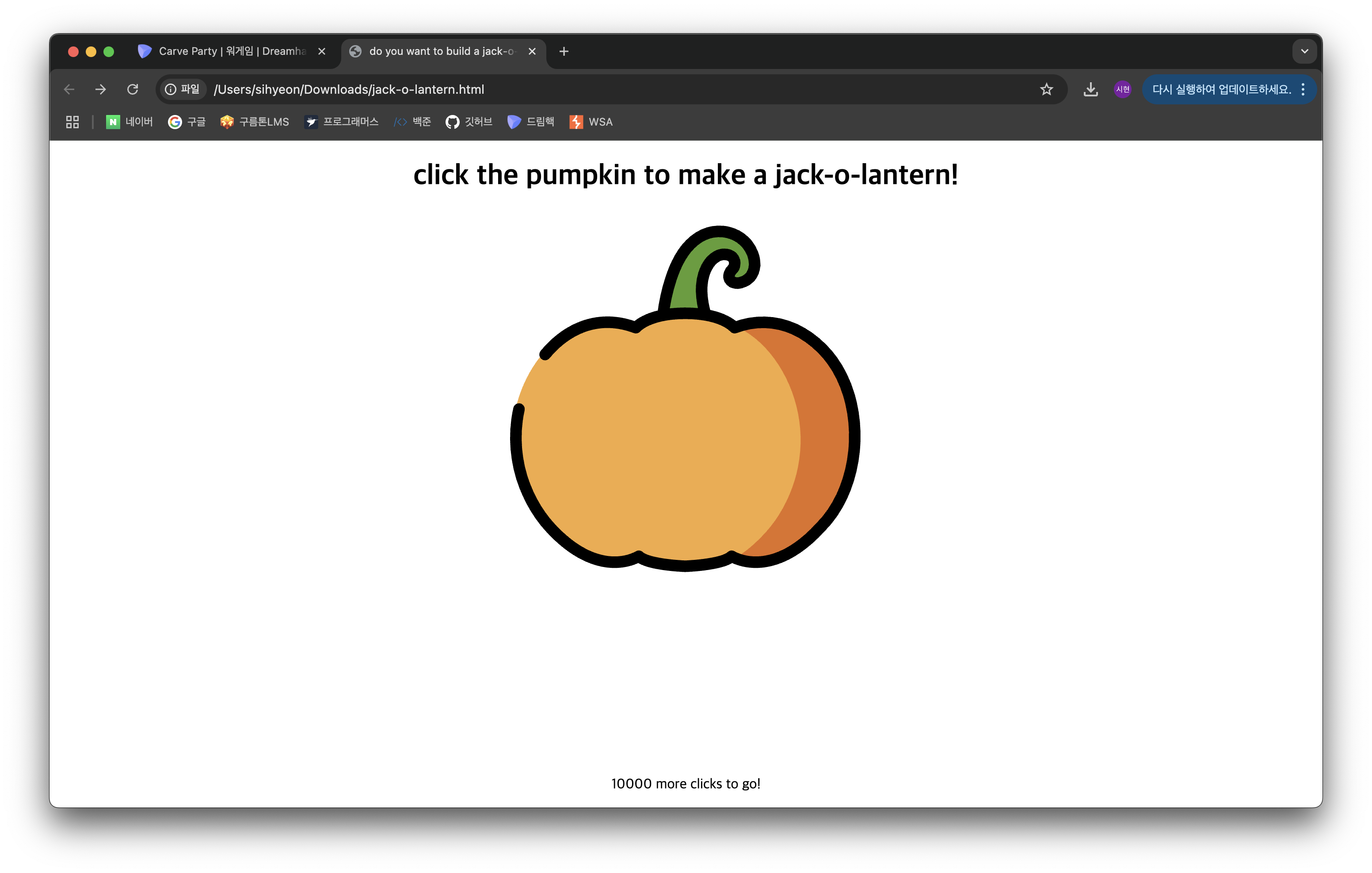 할로윈 파티를 기념하기 위해 호박을 준비했습니다! 호박을 10000번 클릭하고 플래그를 획득하세요!