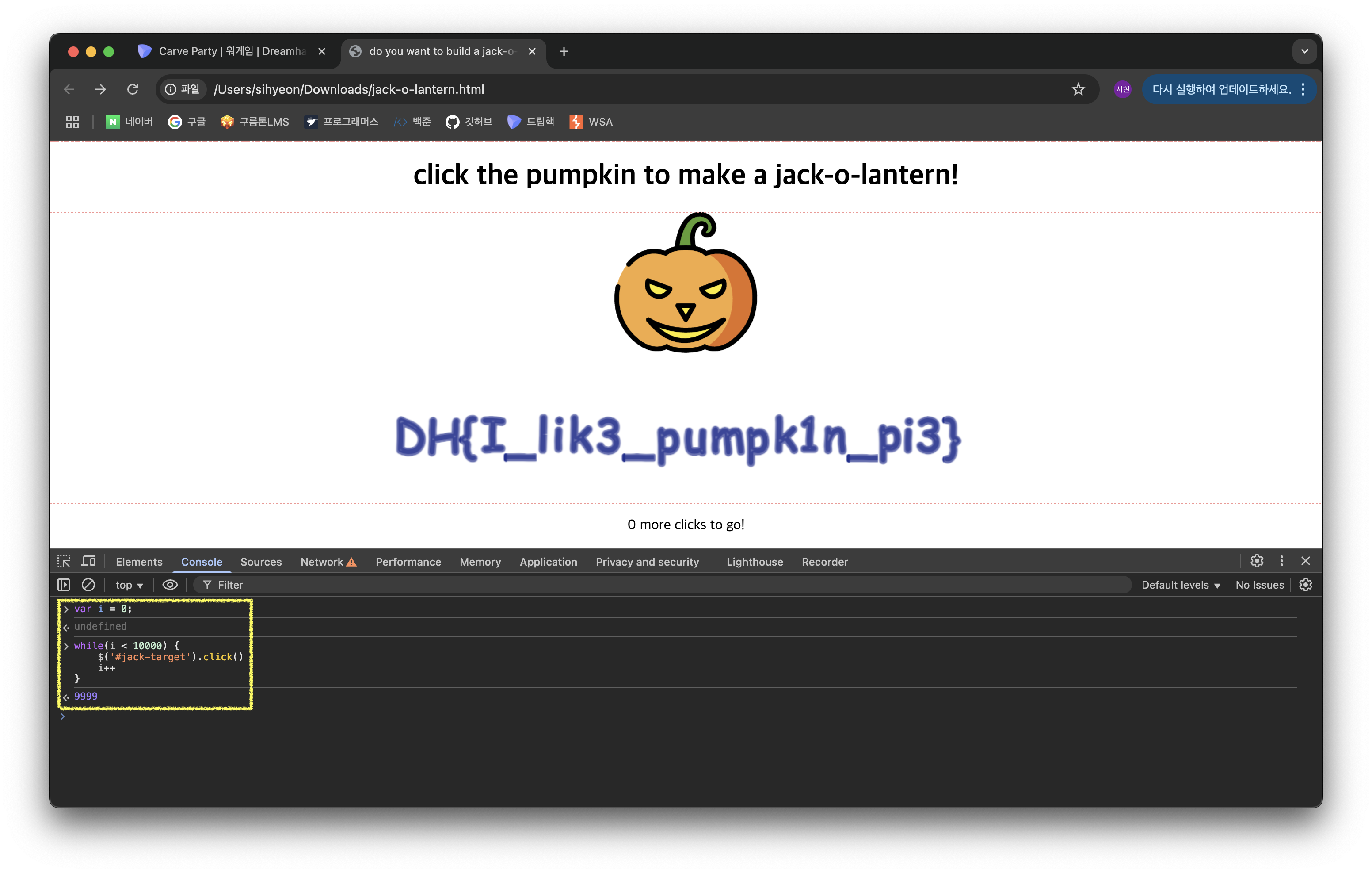 Console창에 코드를 입력 후, 호박을 한번 더 눌러주면 flag 코드가 정상적으로 출력된다.