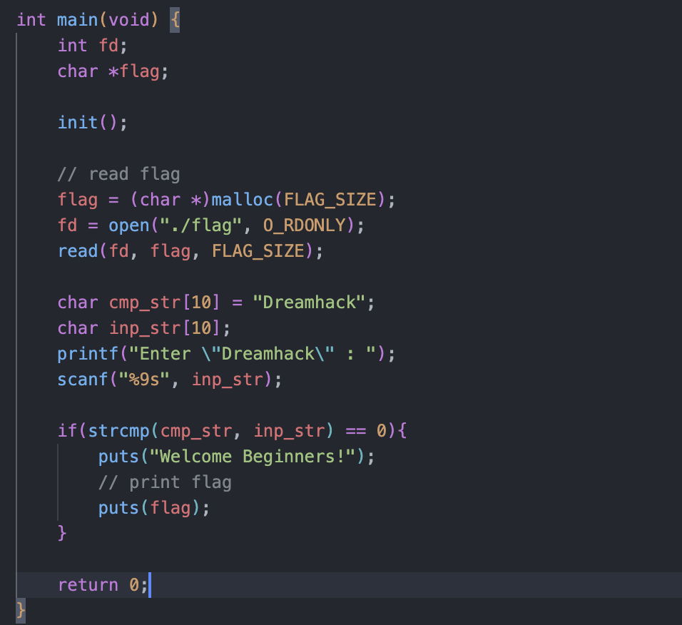 Dreamhack을 입력해주면, 바로 flag가 출력된다.