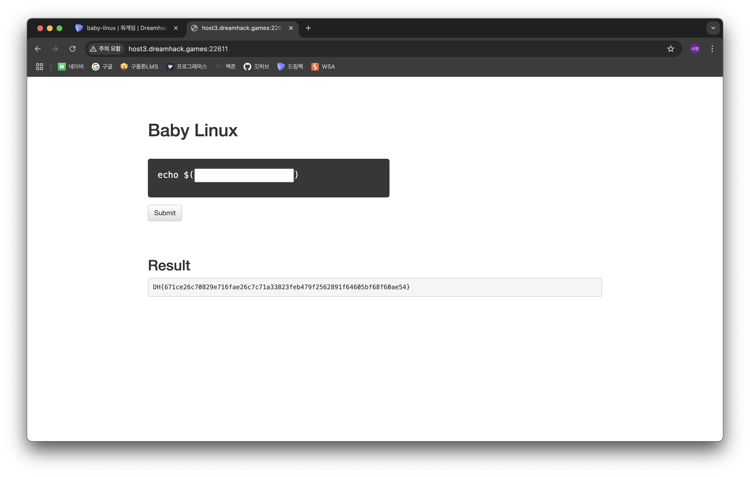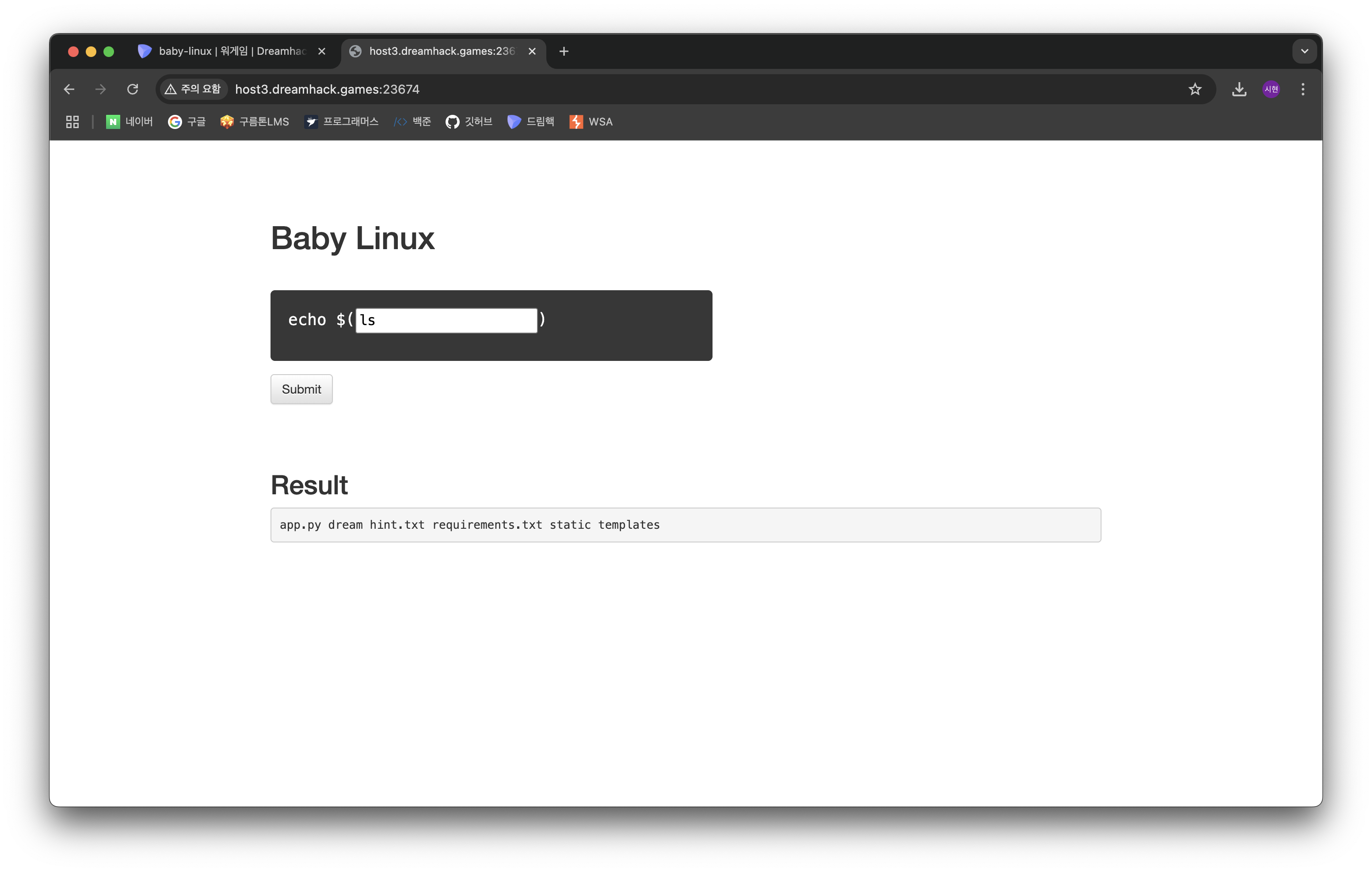 리눅스 명령어를 실행하는 웹 서비스가 작동하고 있습니다.