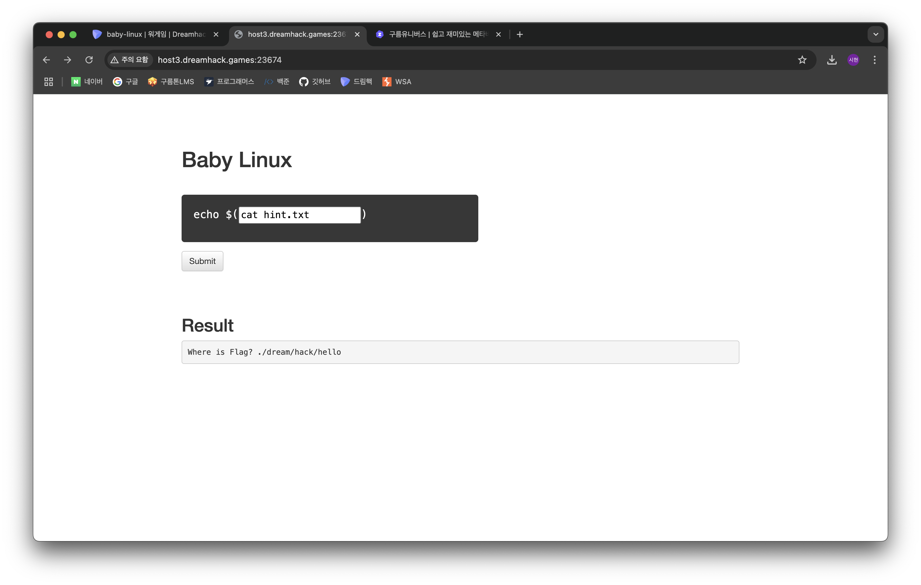 cat ./dream/hack/hello/flag.txt 로 입력했더니 당연히 No! 가 출력된다.