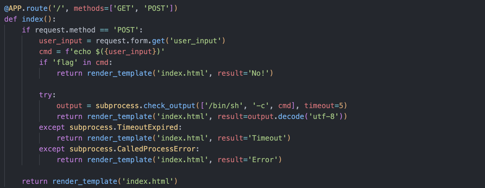 코드는 별거 없고, user_input안에 flag가 들어가 있으면 No!를 출력한다.
