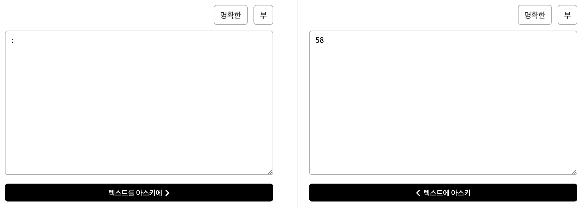오호 아스키코드 58부터 문자가 나오기 시작한다.